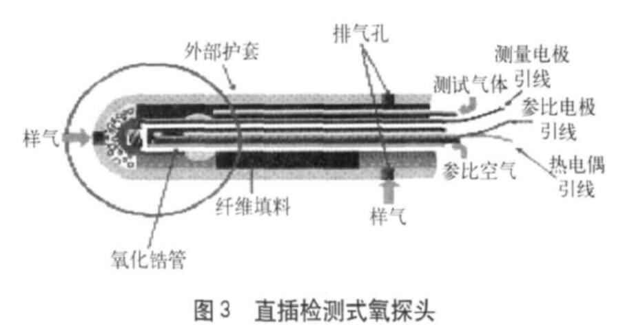 氧探頭使用時,引入被測氣體的方式有直插式和采樣檢測式兩種。直插式響應時間短、不需要加熱器、結構簡單、小型輕便,但要求同時檢測被測氣體的溫度。采樣檢測式由于氧探頭的溫度由加熱器控制,因此測量精度高、工作可靠,但響應時間取決于氣體的流量。