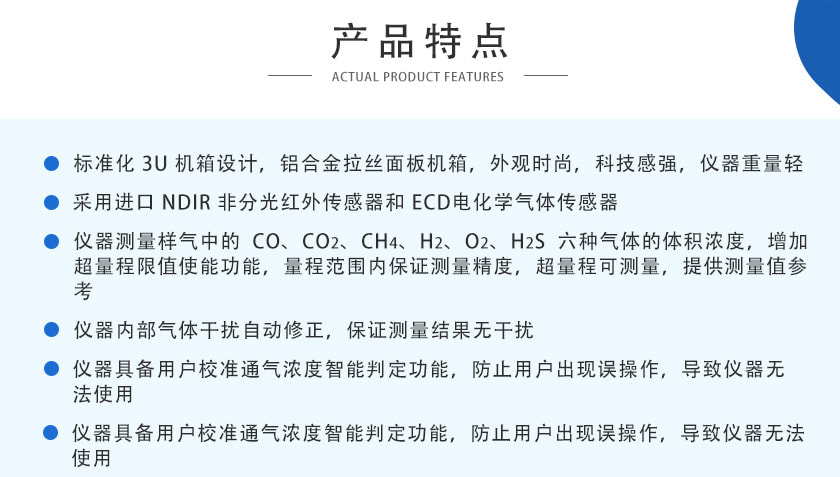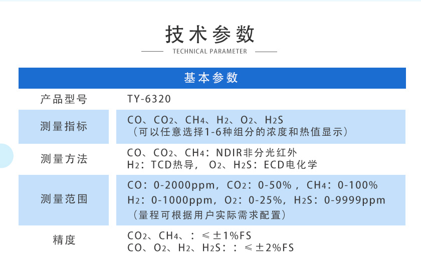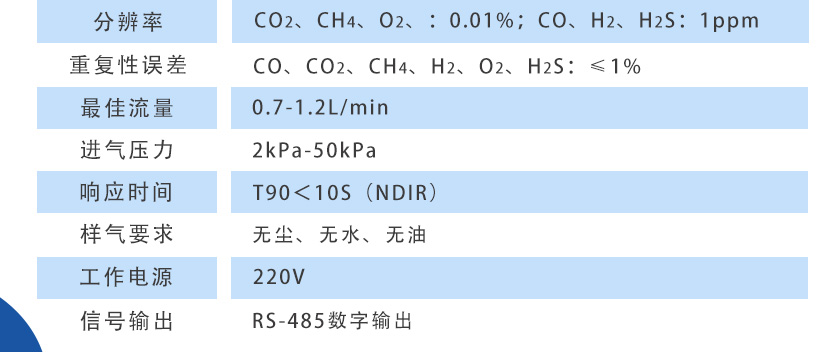 CO2、CH4、:≤±1%FS;CO、O2、H2、H2S::≤±2%FS